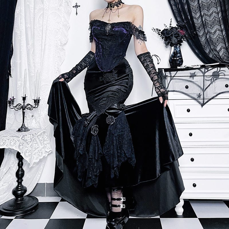 Women's Gothic Black Rose Embroidered Fishtail Maxi Skirt