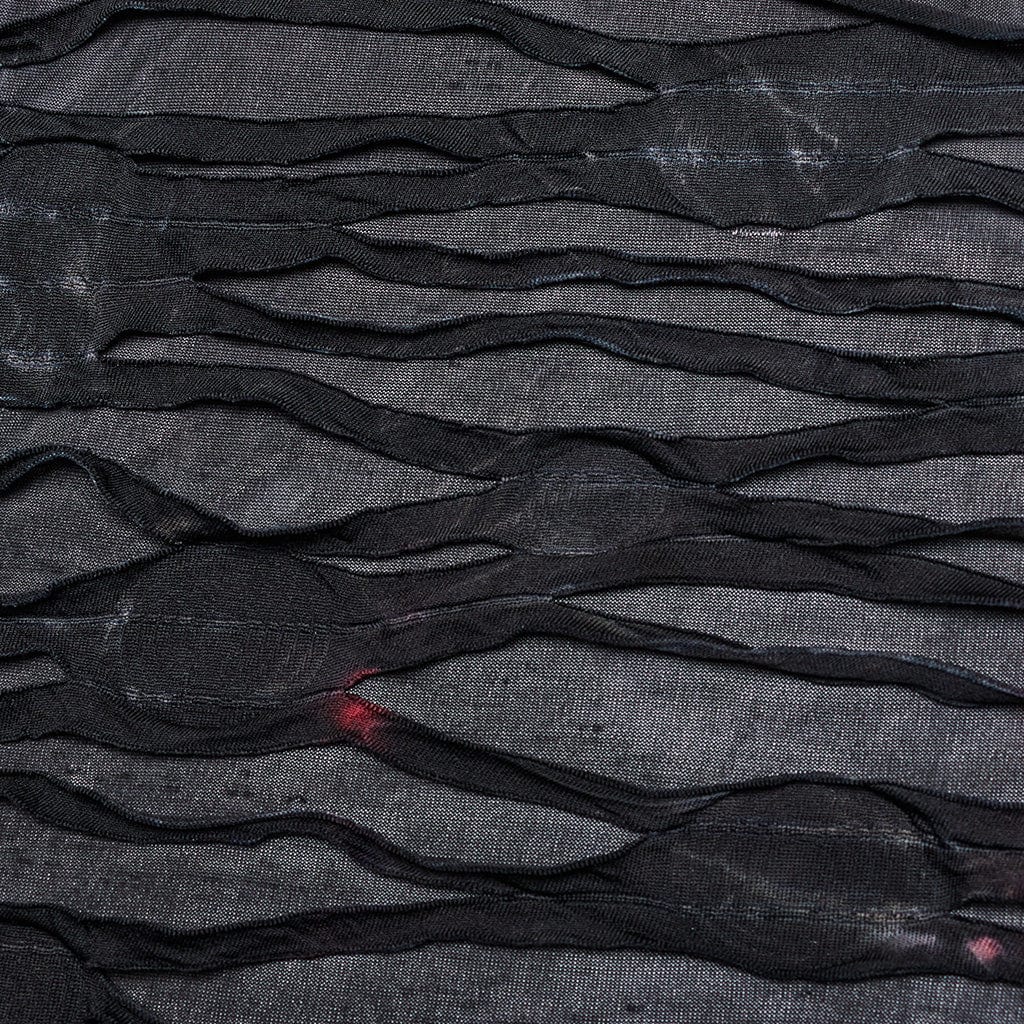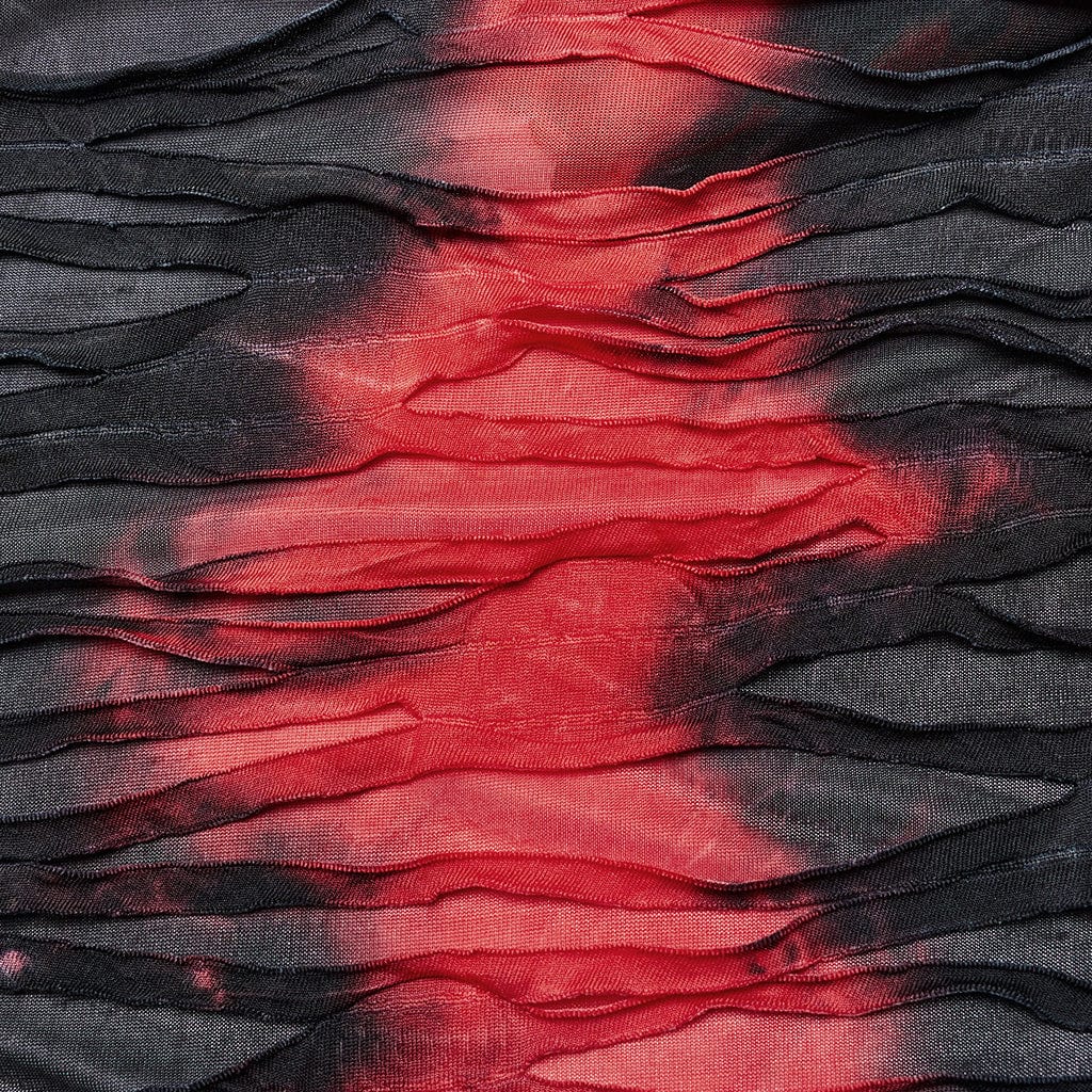 The dress features a rich tie-dye pattern that creates a visually dynamic effect with its swirling, eclectic color contrasts. The bold juxtaposition of colors enhances the gothic aesthetic, making each piece unique. The pattern is further enriched with striped textures that add depth and a touch of vintage charm, making the dress stand out with its layered visual appeal.