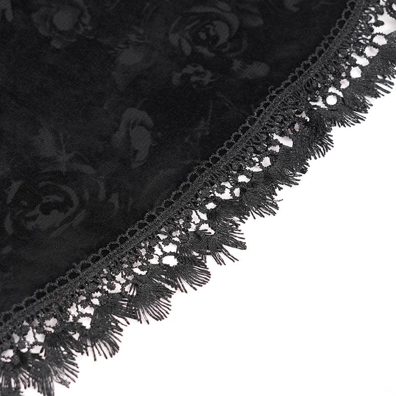 Crafted from luxuriously soft velvet with a delicate flocked floral pattern, this piece exudes timeless elegance with a touch of Victorian and medieval inspiration. The structured bodice features a cutout neckline, adorned with intricate lace details and a gothic cross charm, adding an element of mystery and seduction.