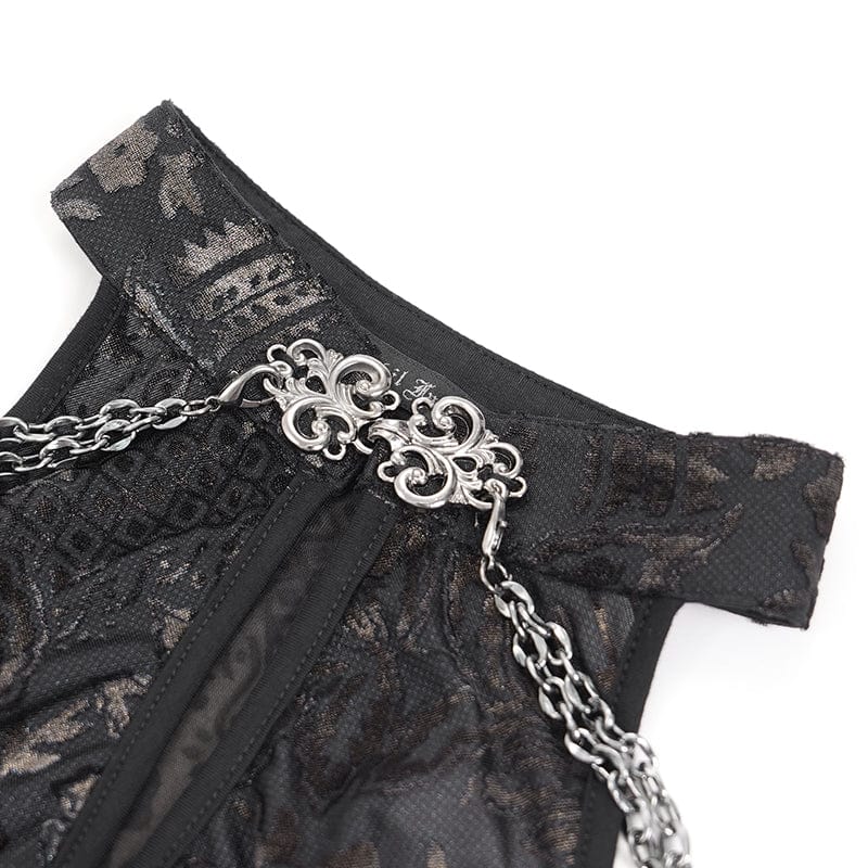 Crafted from jacquard fabric, this gown features an intricate gothic pattern, creating a captivating play of texture and shadow. The high halterneck with a keyhole cutout frames the neckline beautifully, adding a hint of sensuality. Draping metal chain accents cascade over the off-the-shoulder design, lending an aristocratic alchemy gothic touch.