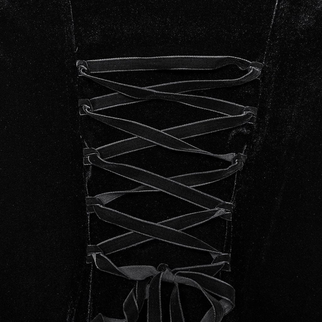 Irregular flared sleeves and lace splicing on both sides introduce a dramatic element, while the lace-up details provide a customizable fit and add to the gown's gothic charm. The back of the gown features a lace-up closure for a tailored fit, ensuring it contours perfectly to your figure.