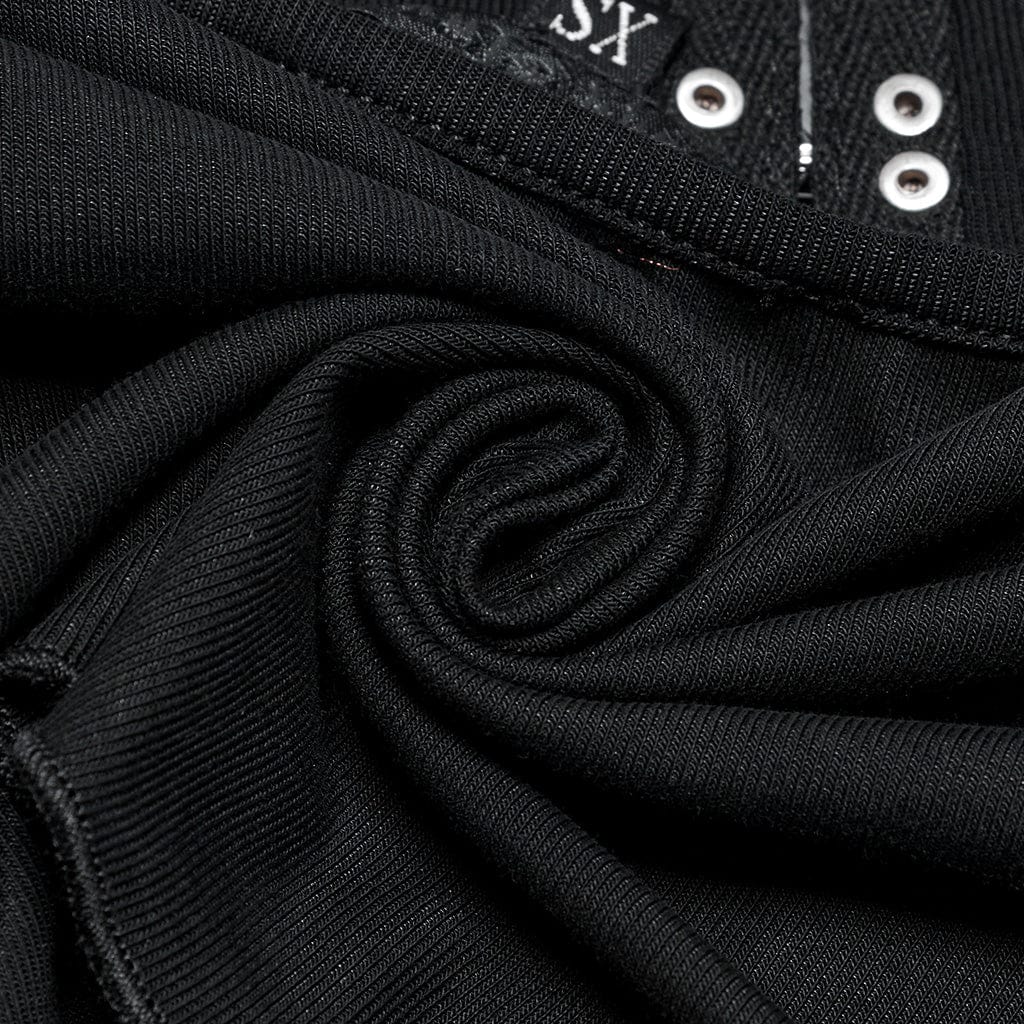 The sexy ruffled halter neck beautifully frames the shoulders, giving you a sophisticated, yet punk goth look, while the off-the-shoulder design adds a bold, feminine touch. The front features detachable metal buckles, making it easy to slip on and off while adding an industrial, gothic vibe to the shirt.