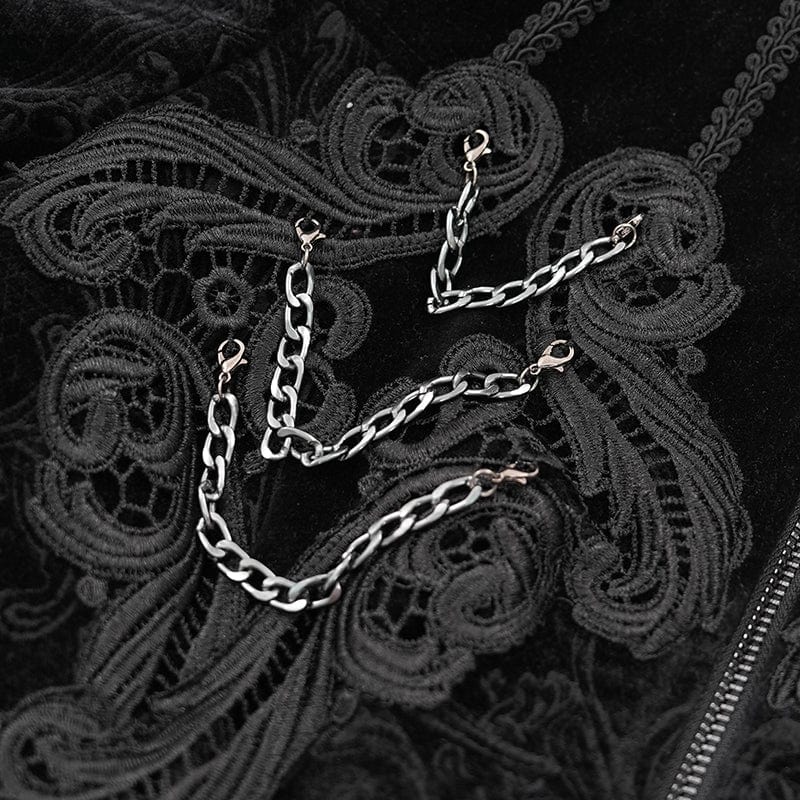 One of the most striking elements of this piece is the exaggerated puff sleeves with flared cuffs, trimmed with delicate lace, evoking a Victorian-inspired elegance that seamlessly blends with a modern gothic touch. A subtle chain detail across the embroidered chest panels adds a hint of rebellious allure, making this jacket the perfect choice for those who love dark romance with a hint of edge.
