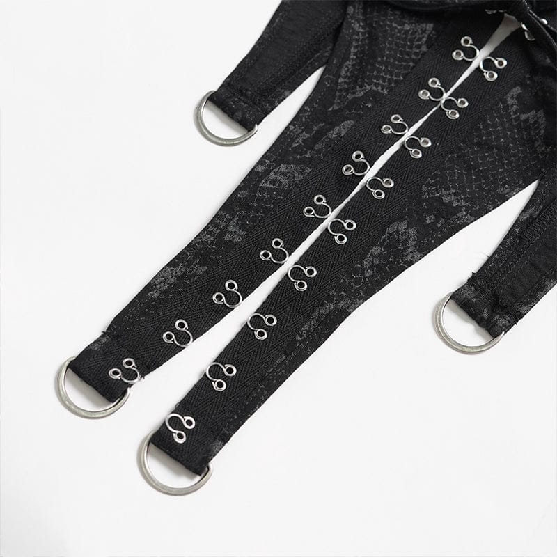 Its off-the-shoulder design is accented with metal chain details, while the back features a lace-up closure for a customizable fit. The plunging turn-down collar and irregular hem further amplify its punk attitude, making it a standout addition to any punk goth wardrobe.