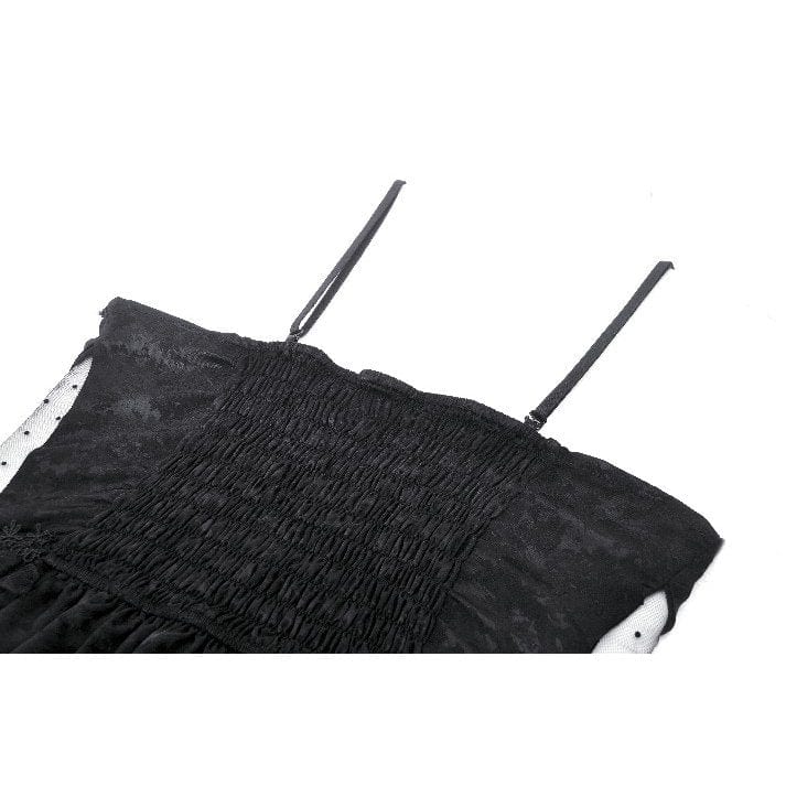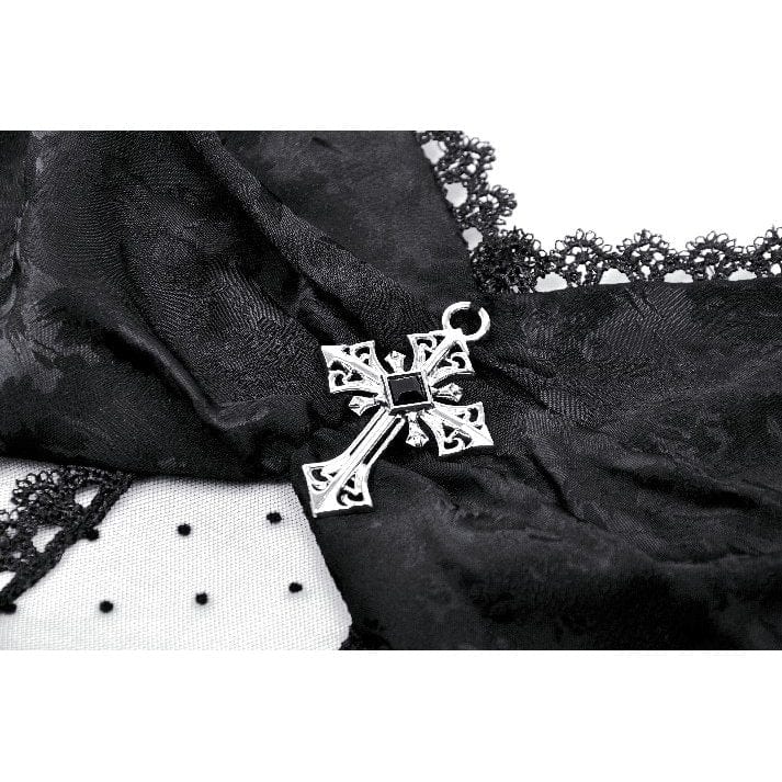 The centerpiece of this top features intricate patchwork with polka-dotted lace, adding a playful yet gothic touch to the overall design. The lace hem on the neckline enhances its Victorian Gothic appeal, providing a refined and elegant finish. A striking metal cross adorns the front, serving as a focal point that captures the eye and reinforces the gothic theme.