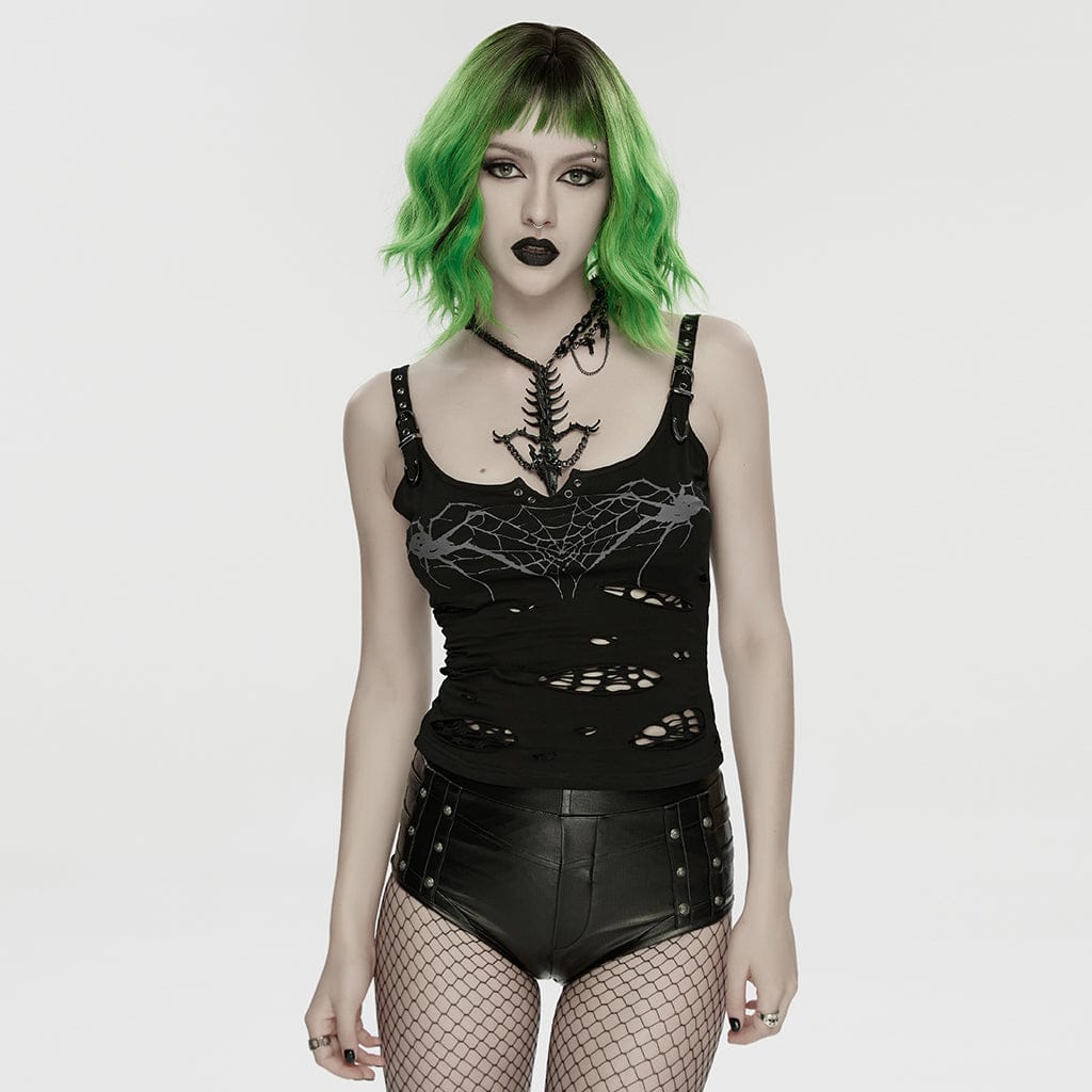 Women's Punk Spiders&Web Printed Tattered Tank Top Black