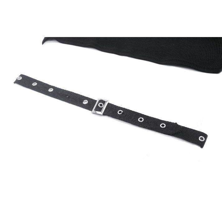 The top features adjustable eyelet straps that are connected by a metal ring, extending from the chest to the waist. This unique strap design not only adds an element of punk aesthetics but also allows for customizable fit and styling options.