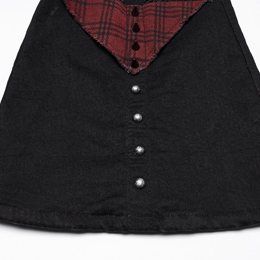 The front showcases ripped accents with sheer mesh underlays, adding a seductive yet tough appeal, while the stitched plaid paneling in deep red and black adds a rockabilly twist. Designed for both style and comfort, these pants feature a fitted silhouette with slight elasticity, allowing easy movement while maintaining a sculpted shape. The spiked semi-circles seamlessly connect with the eyelet webbing, emphasizing the meticulous craftsmanship and darkly gothic punk allure.