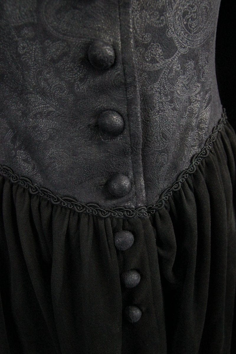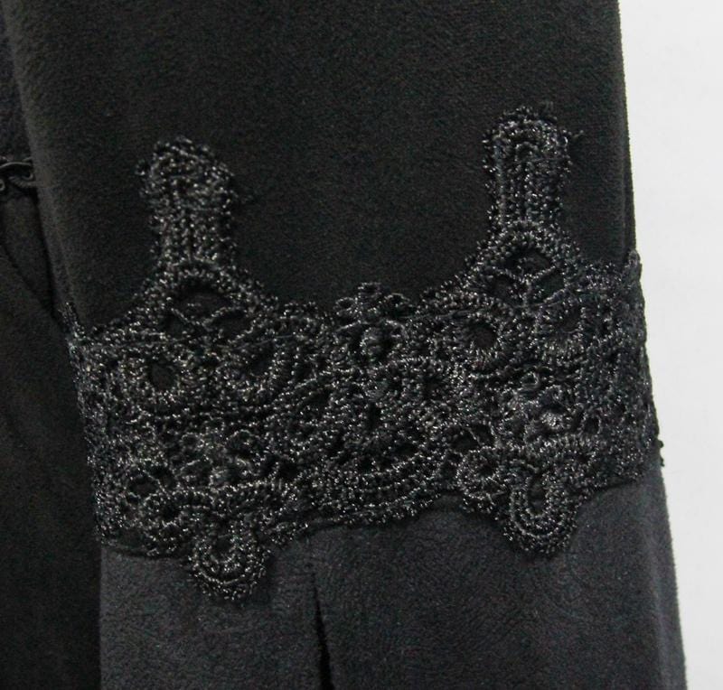 Description:This is a dress that is perfect to play the part of a wicked witch. The close fitting dress has flowing trumpet angel sleeves that are trimmed with lace and a deep hood which is lined with delicate lace  and forms a lovely collar when thrown back. The front open dress has large ornamental buttons and delicate detailing around the waist and the sleeves.