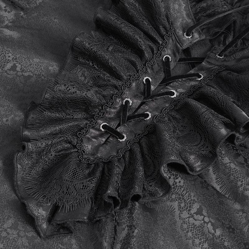 The standout feature of this shirt is its ruffled stand collar adorned with delicate lace, adding a touch of Victorian-inspired elegance to the design. The ruffled lace patchwork on the collar creates a dramatic silhouette, making a bold statement while exuding gothic romance.