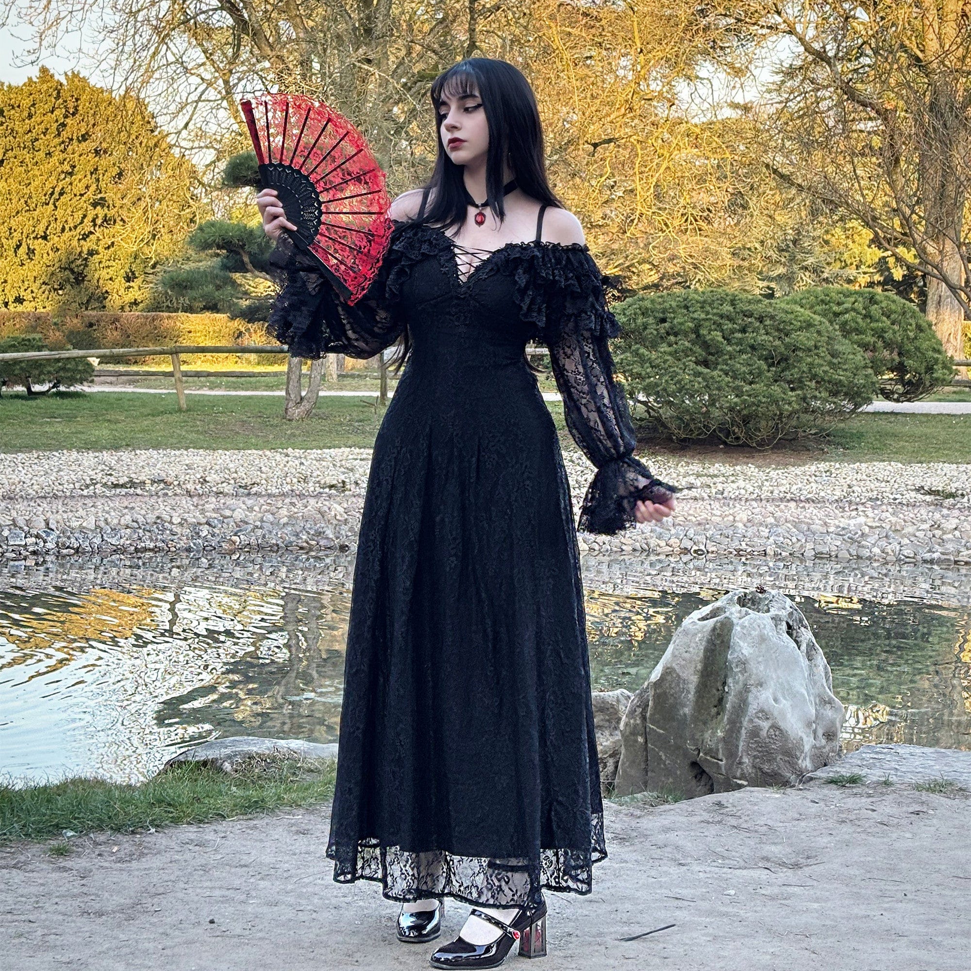 The lace sleeves with flared cuffs enhance the Victorian gothic vibe, making it perfect for those who appreciate the beauty of dark, historical elegance. The long silhouette creates a regal appearance, flowing gracefully with every step, while the adjustable back lacing allows for a customizable fit, ensuring comfort and a flattering shape.