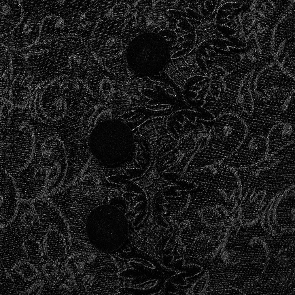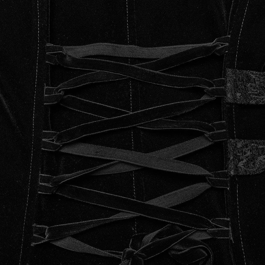 This gothic long coat is made of jacquard and velvet fabric. Asymmetric stand collar design and metal zipper inside the placket. Buckle straps on the side and lace-up on the back for adjustment. Fitted silhouette and no elastic fabric.