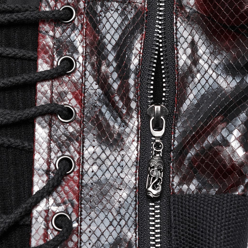 For practicality and ease of wear, the corset features both a zipper closure and an adjustable drawstring at the back, blending functionality with high-fashion appeal. The slim-fitted silhouette and slightly elastic fabric ensure a snug yet comfortable fit, making this a versatile piece for layering over shirts, pairing with skirts, or styling with leather pants for a full gothic grunge or cyberpunk look.