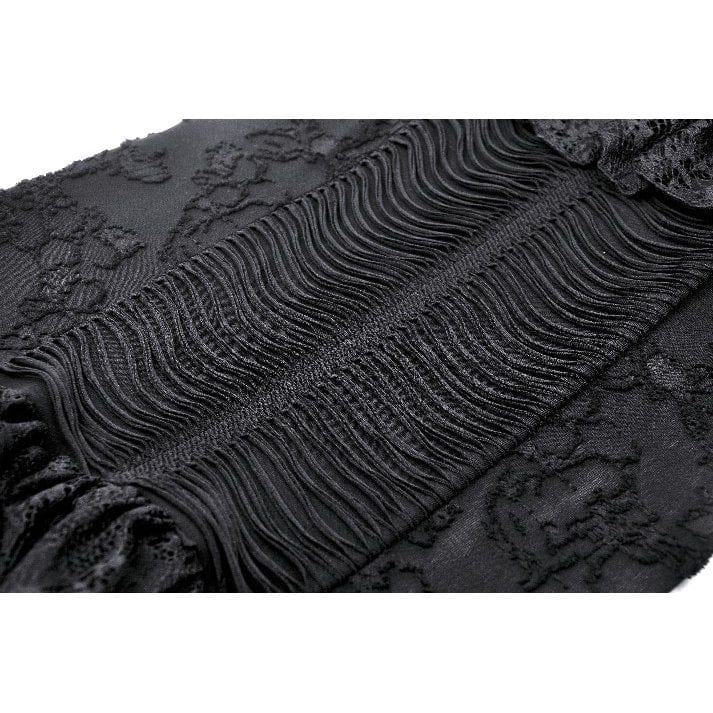Ruffled lace patchwork on the neckline and waist adds a touch of femininity and contrast to the ruggedness of the distressed fabric. The combination of lace and distressed fabric creates a dynamic visual effect that balances edginess with elegance.